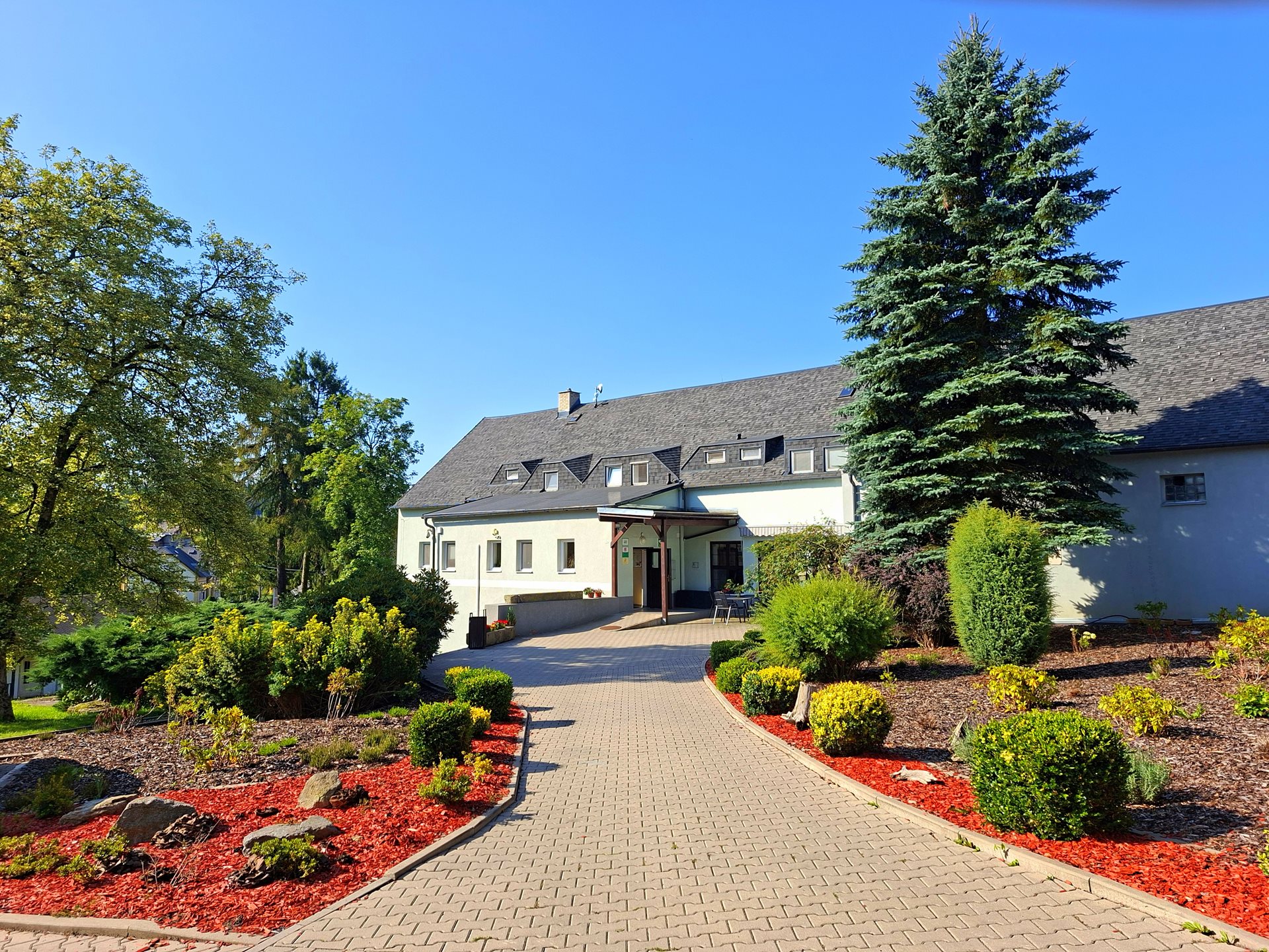 V tomto domě poskytujeme sociální službu Chráněné bydlení. Rodinný dům je umístěn v běžné zástavbě okolních domů mimo hlavní areál v Horní Poustevně. Má dvě podlaží, v přízemí je samostatná kuchyně, jídelna s funkcí obývacího pokoje, WC, koupelna a část pokojů klientů. V prvním patře jsou pokoje klientů.