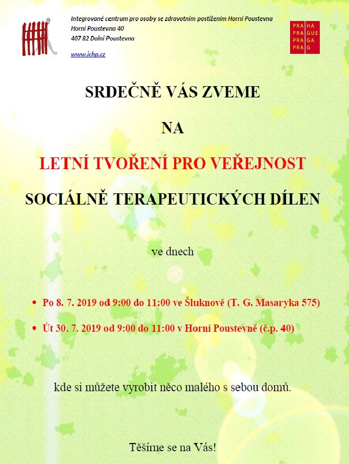 Ani letošní prázdniny nebudou pro Sociálně terapeutické dílny ve znamení lenošení. Mimo obvyklých činností s uživateli IC, si celý tým dílen připravil LETNÍ TVOŘENÍ PRO VEŘEJNOST. Neváhejte si k nám přijít vyrobit něco pěkného a seznámit se s prostředím, tolik oblíbeným našimi uživateli.