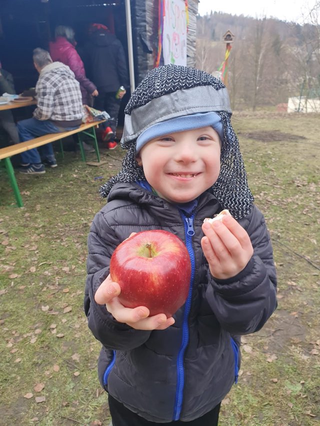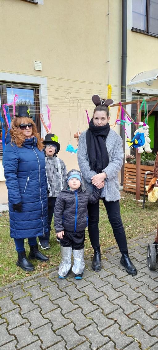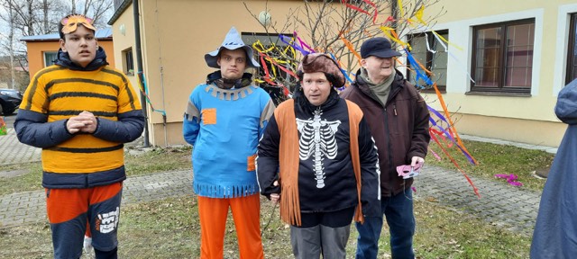 Po procházce se průvod vrátil zpět na zahradu IC. Po takové procházce vyhládne, prvním úkolem pro klienty bylo odstrojení stromu hojnosti, který byl obsypán všelijakými dobrotami. Tak se do sytosti hodovalo na jitrnicích, preclících, koláčích a ovoci. Pro klienty byly připraveny i soutěže. Hod balónkem na cíl, slalom a lovení plyšáků.